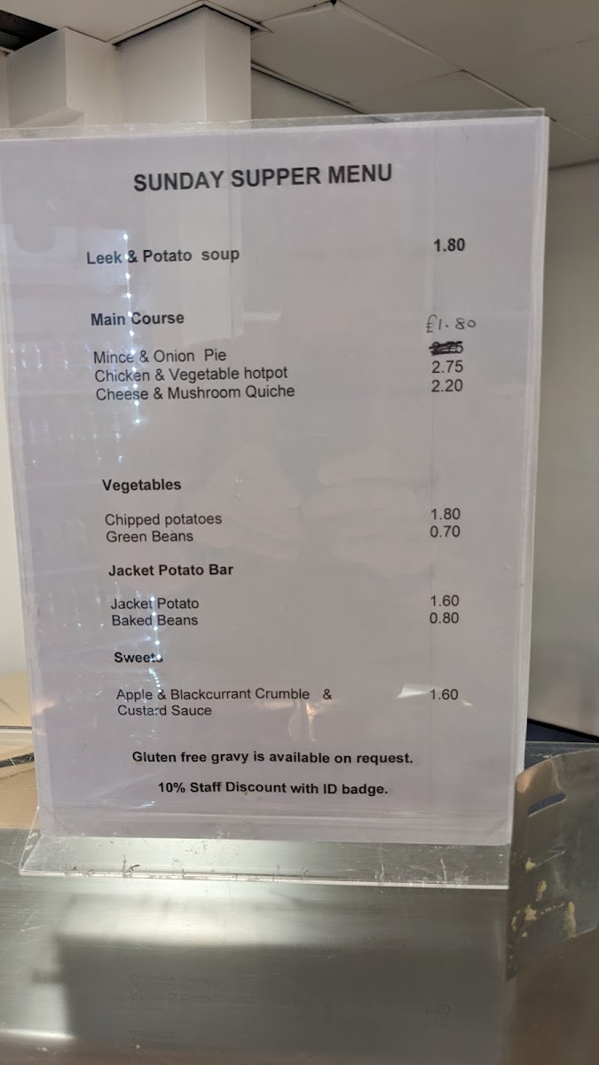 The menu offers a variety of food options structured into several distinct groups. There is a selection of vegetables including items such as chipped potatoes and green beans. The jacket potato bar provides choices like jacket potato with baked beans, suitable for those looking for a simple and quick meal.